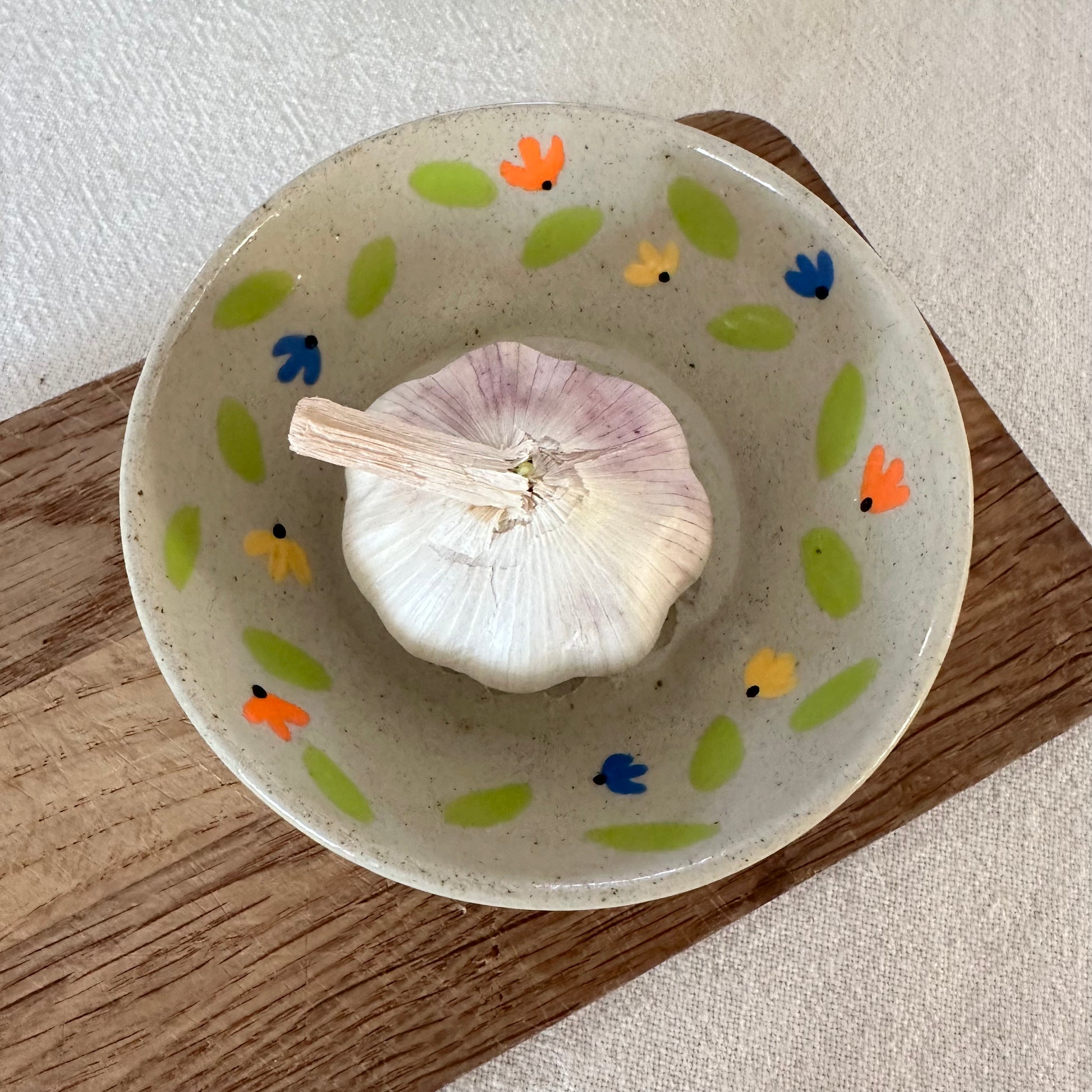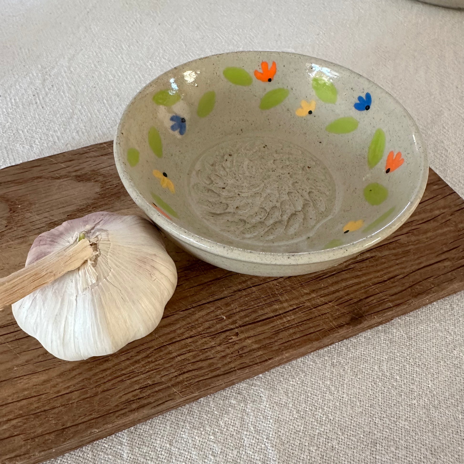 En liten skål för att riva vitlök med. Skålen är gjord i återvunnen lera vilket ger en något grå/beige ton och små prickar.